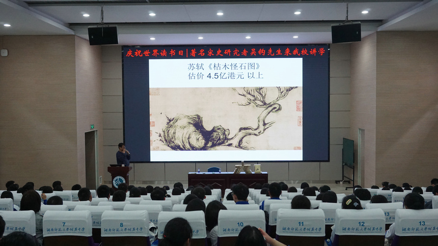 4月23日下午,为庆祝第二十六个世界读书日,学校与长沙市新华书店联合举办了“赏宋画,知历史,掌握历史学习法”专题讲座。著名作家、宋史研究专家吴钩先生应邀来校讲学,高二全体选修历史类学生和部分老师前往学校会议厅听取专家讲座。活动由学校之谟图书馆馆长杨帆老师主持。