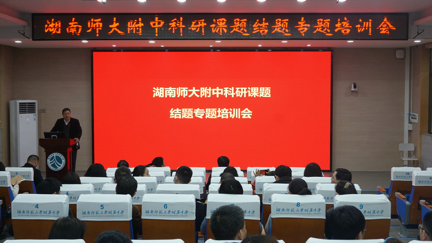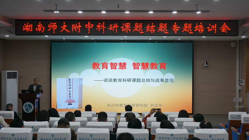 长沙市教育科学研究院理论研究室刘正华主任作了《教育智慧,智慧教育——谈谈教育科研课题总结与成果显现》的专题讲座。他从研究意识、研究能力、研究方法、研究成果等四个方面全面阐说了教育科研的意义、价值和方法,结合具体案例重点解析了科研课题结题的具体要求、方法技巧和注意事项。