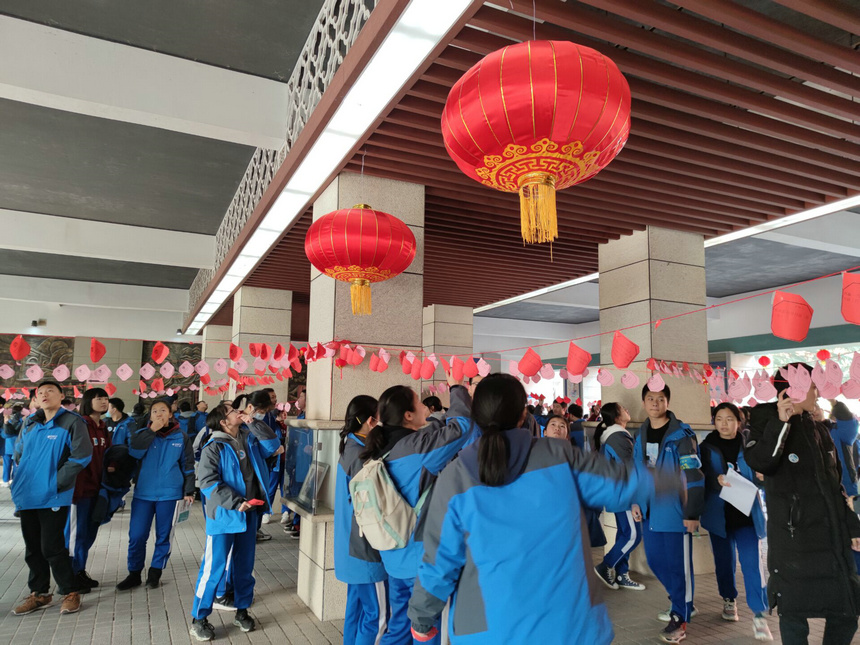 12月25日中午,线下(现场)有奖猜谜活动在惟一楼一楼名人文化广场正式拉开帷幕。名人文化广场内热火朝天,由各社团提供的一千五百多个谜语卡悬挂在红绳上,随风而动,红灯笼装点喜庆,营造了欢乐祥和的新年气氛。各年级学生积极参与现场谜语有奖竞猜。在红色灯谜的汪洋中,不时传来猜出谜面的惊喜声,和答错谜题的唏嘘声,猜谜者全身心投入,脸上无不是喜笑颜开。谜会当天正值校园文化艺术节闭幕式,来自集团校的部分学生也参与其中,体验附中活动,感受附中文化。部分谜题由附中各社团结合自身社团文化设计,凸显附中社团生生活力。