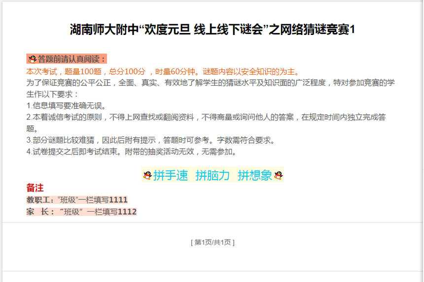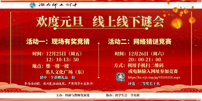 为弘扬中华优秀传统文化,丰富师生校园文化生活,12月25日-26日,由科研与教师发展处主办、校学生会和学社联协办的湖南师大附中“欢度元旦线上线下谜会”活动如期举行。