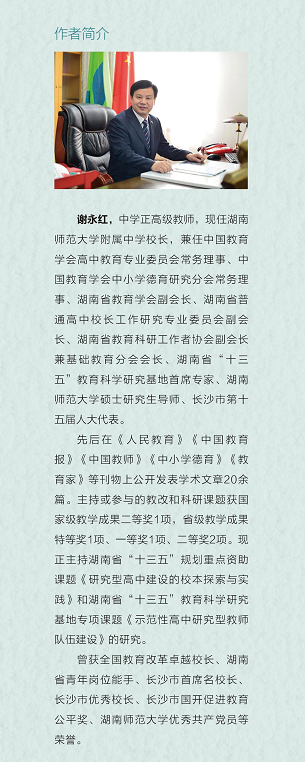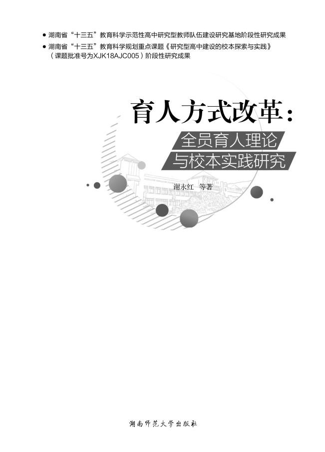 《育人方式改革:全员育人理论与校本实践研究》是湖南省“十三五”教育科学研究基地建设阶段性研究成果,也是湖南省“十三五”教育科学规划重点课题《研究型高中建设的校本探索与实践》阶段性研究成果。学校于2015年提出了创建研究型卓越高中的办学新追求,其目标任务之一就是要开展全员育人理论与校本实践研究,探索普通高中育人方式改革的路径与规律。多年来,学校聚焦立德树人根本任务,深入挖掘多元育人主体的教育潜能,全面实施系统合力育人,取得了显著育人成效和丰富育人经验。本书对此进行了较为全面的梳理、总结和提炼,可以说是湖南师大附中全员育人理论与校本实践探索的全景式记录。