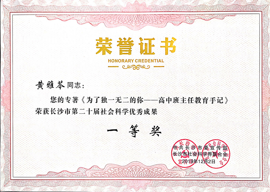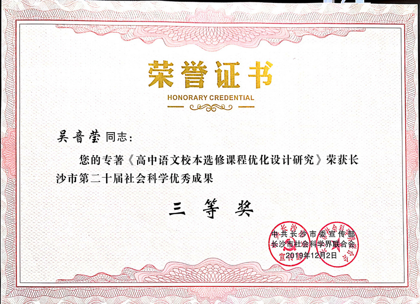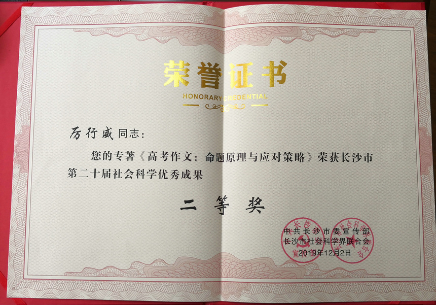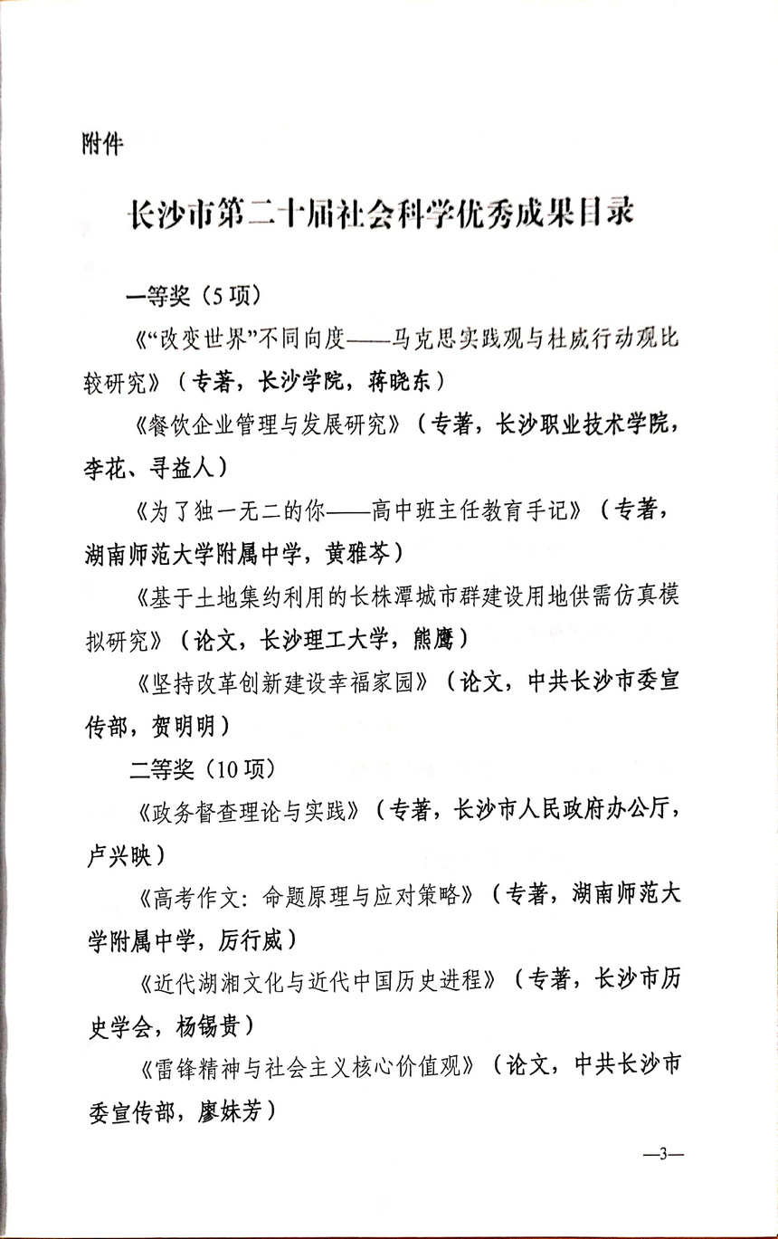 大会颁发了长沙市第二十届哲学社会科学优秀成果奖。其中一等奖共5项,我校黄雅芩老师专著《为了独一无二的你--高中班主任教育手记》荣获一等奖;二等奖共10项,原我校语文教研组长厉行威老师专著《高考作文:命题原理与应对策略》荣获二等奖;三等奖共15项,我校吴音莹老师专著《高中语文校本选修课程优化设计研究》荣获三等奖。