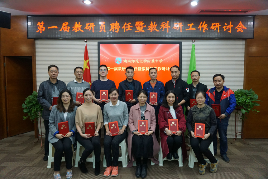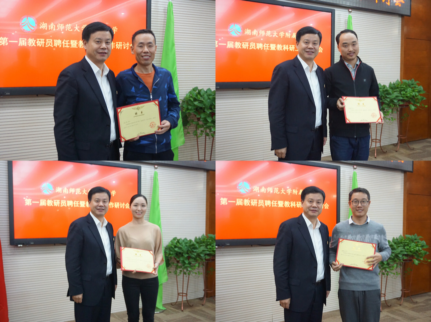 谢永红宣读了《关于公布湖南师范大学附属中学第一届学科教研员名单的通知》,然后为获聘的14位教研员颁发《聘书》并合影留念。