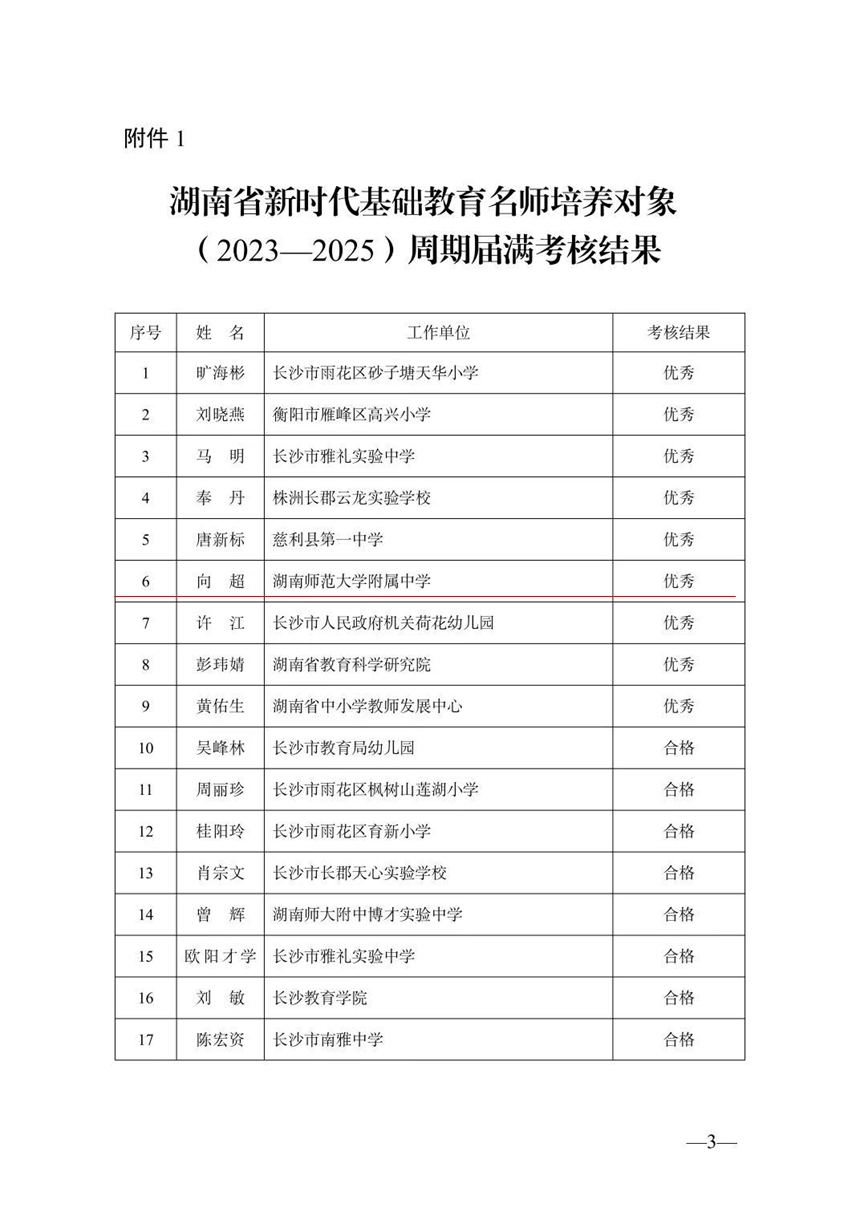 近日,湖南省教育厅发布《关于湖南省新时代基础教育名师名校长培养对象(2023—2025)周期届满考核结果的通报》,我校向超老师获评名师培养对象优秀等次,李湘黔老师考核合格。两位老师在三年培养周期中将“育己”和“育人”结合,聚焦省教育规划“双名”专项课题研究,以湖南省名师工作室建设为中心,取得了丰硕的教研成果,培养带动了一批卓越教师和青年骨干教师成长,发挥了显著的辐射带动作用,既彰显了两位教师的专业素养和专业发展高水平,也体现了我校师资队伍建设的扎实成效,呼应了省级“双名计划”的核心初衷。