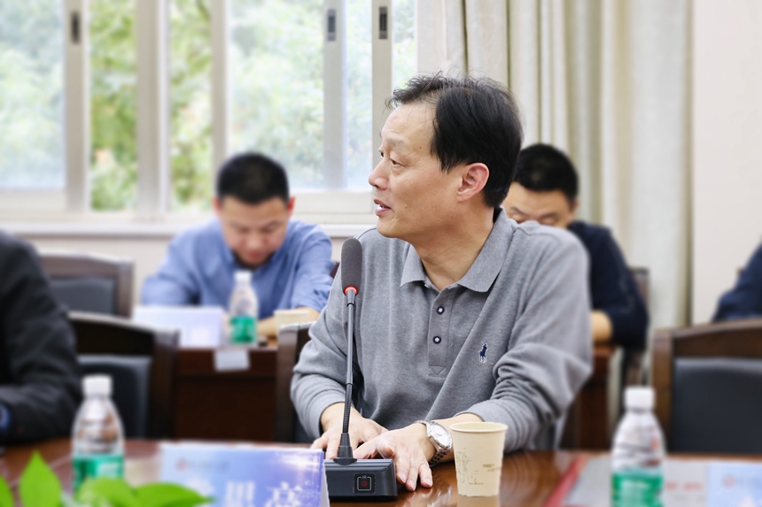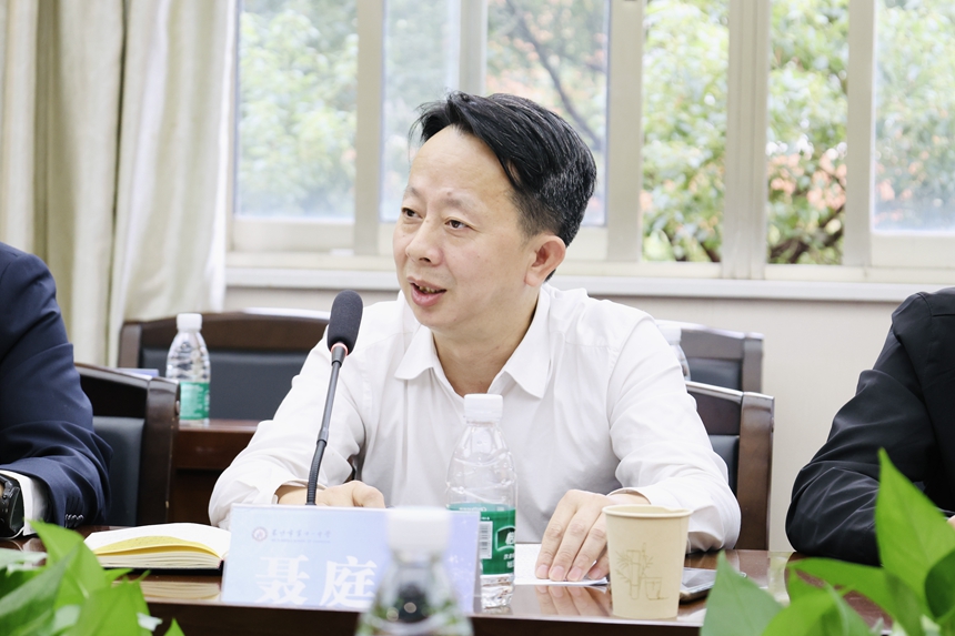 常思亮代表基地联合单位发言。他对湖南省“十四五”普通高中教育研究基地落户湖南师大附中表示热烈祝贺,表示作为联合单位,湖南师大教科院将进一步加强与湖南师大附中及各联合学校、协同学校的联系,为大家提供人才输送、课题研究、师资培训及决策咨询的大力支持。