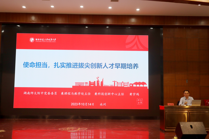 党委委员、课程与教学处兼科技创新中心主任黄宇鸿作《使命担当,扎实推进拔尖创新人才早期培养》的专题讲座,从湖南师大附中拔尖创新人才早期培养为什么重视、效果怎么样、为什么成绩显著三个方面对学校拔尖创新人才早期培养体系做了全面介绍。