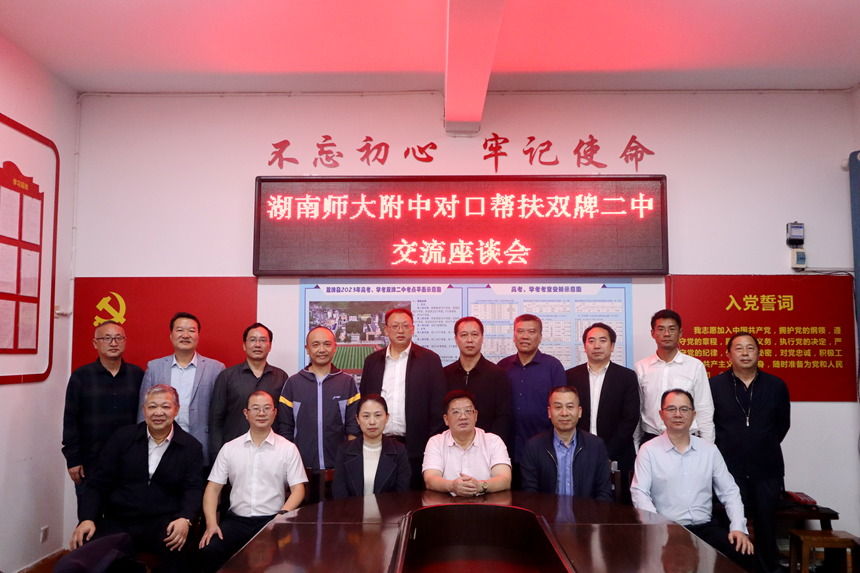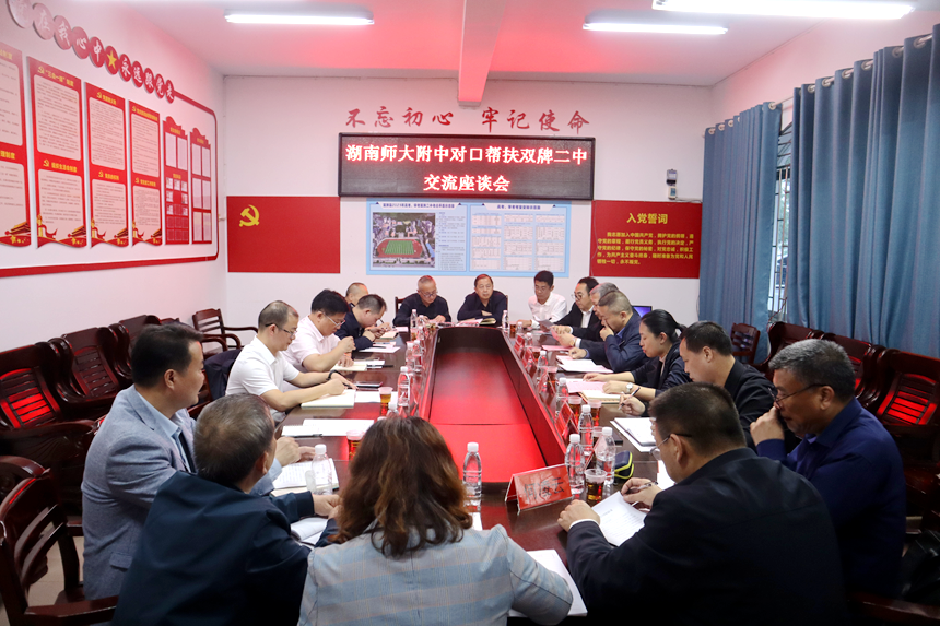 13日下午,我校团队到双牌县第二中学开展教育交流活动。双牌县委常委、县委办主任王焕金,县人民政府副县长石婧出席湖南师大附中对口帮扶双牌二中交流座谈会。座谈会由县教育局局长杨义荣主持。会上,县人民政府副县长石婧致欢迎词。双牌二中党总支书、校长何凌云作学校情况汇报。我校团队从课程标准解读、高考复习课模式构建和体现学生主体地位等角度进行课堂教学问题诊断,分别点评了会前视导的高三地理、化学、历史课和高一的心理课。党委书记黄月初表示,到地方帮扶是省属高中的责任,师大附中与永州历史渊源深厚,将在对口帮扶中主动担当,勇于作为,积极发挥示范辐射作用,今后将与双牌二中开展全方位、多层次的合作交流,推动两校携手共进、跨越发展。县委常委、县委办主任王焕金代表双牌县委、县政府和双牌人民向湖南师大附中莅临双牌进行对口帮扶表示感谢,要求双牌二中以学生为中心,更新教育理念,抓好管理环节,积极对接学习,切实推动县域高中高质量发展,实现创新拔尖人才早期培养新突破。