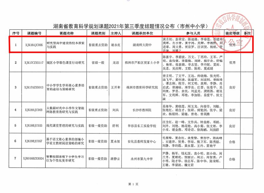 近日,湖南省教育科学规划领导小组办公室下达《湖南省教育科学规划课题2021年第三季度结题情况公布(市州中小学)》,校长谢永红主持的《研究型高中建设的校本探索与实践》顺利结题并被评定为“优秀”。