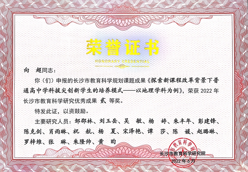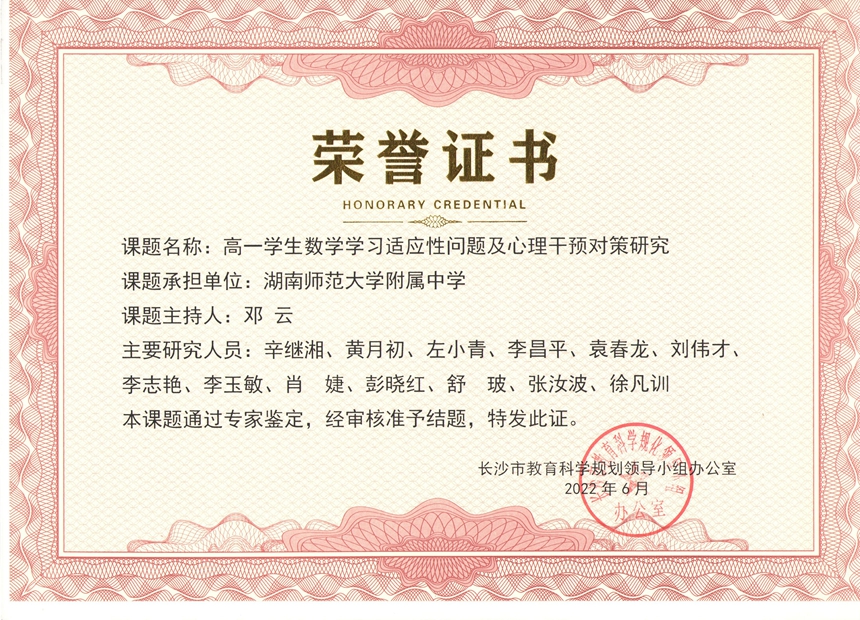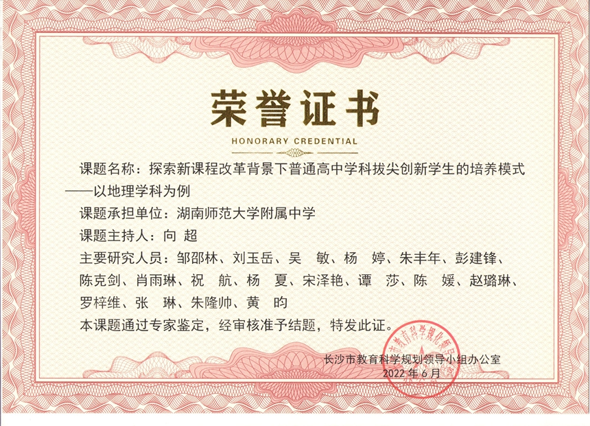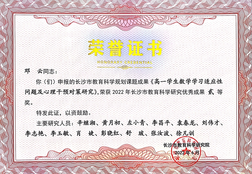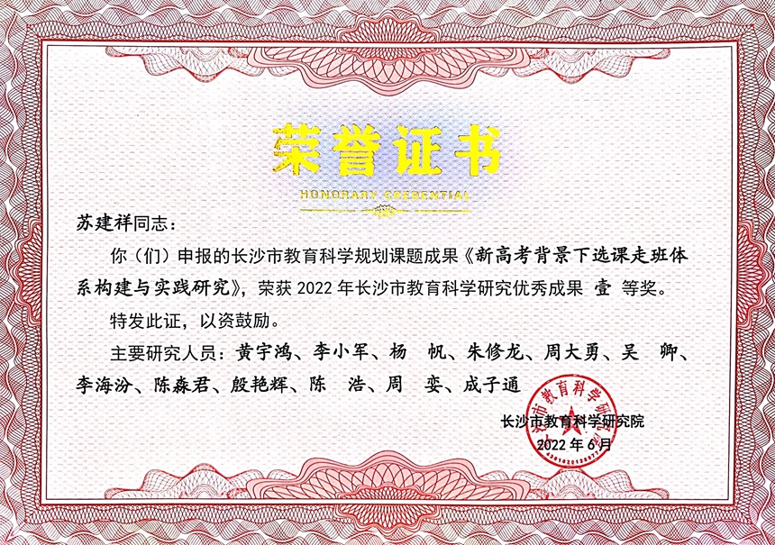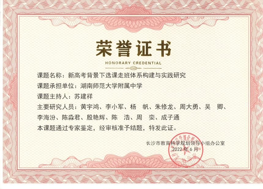 近日,长沙市教育科学规划领导小组办公室下达结题证书,我校三项市级规划课题均准予结题,并均荣获2022年长沙市教育科学研究优秀成果奖。其中,副校长苏建祥主持的市级重大委托课题《新高考背景下选课走班体系构建与实践研究》荣获2022年长沙市教育科学研究优秀成果奖一等奖,科研与教师发展处副主任向超主持的市级一般课题《探索新课程改革背景下普通高中学科拔尖创新学生的培养模式——以地理学科为例》和数学教研组邓云老师主持的市级一般资助课题《高一学生数学学习适应性问题及心理干预对策研究》均荣获2022年长沙市教育科学研究优秀成果奖二等奖。
