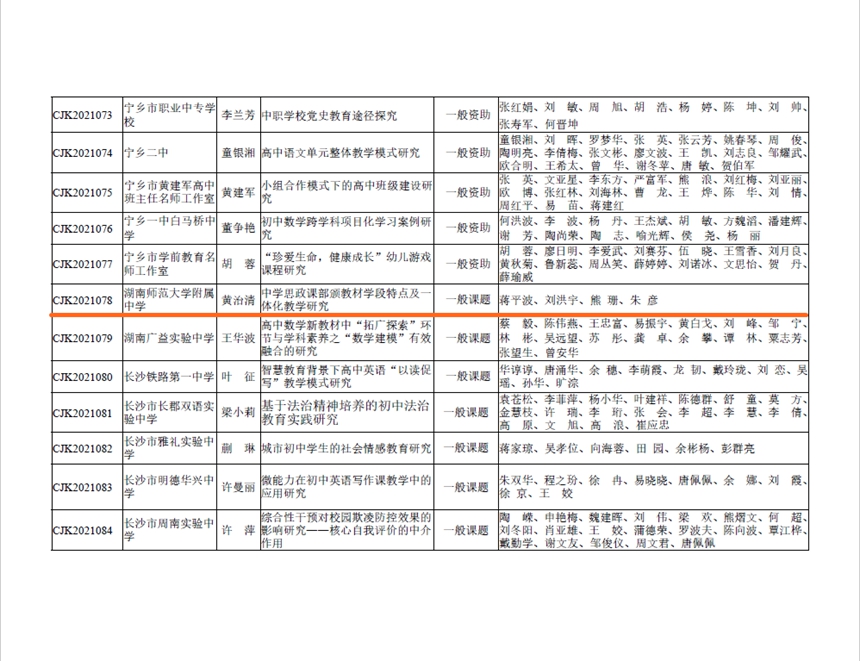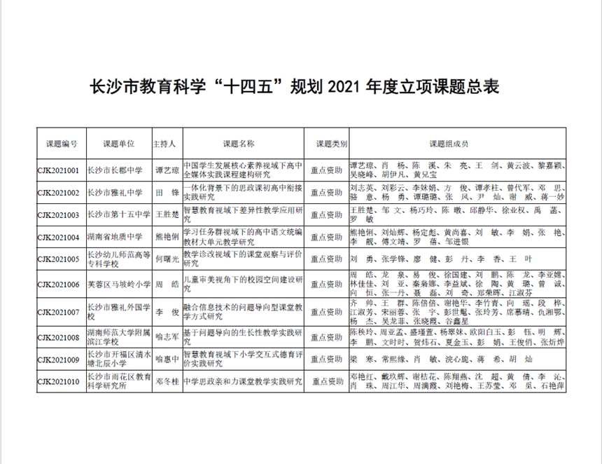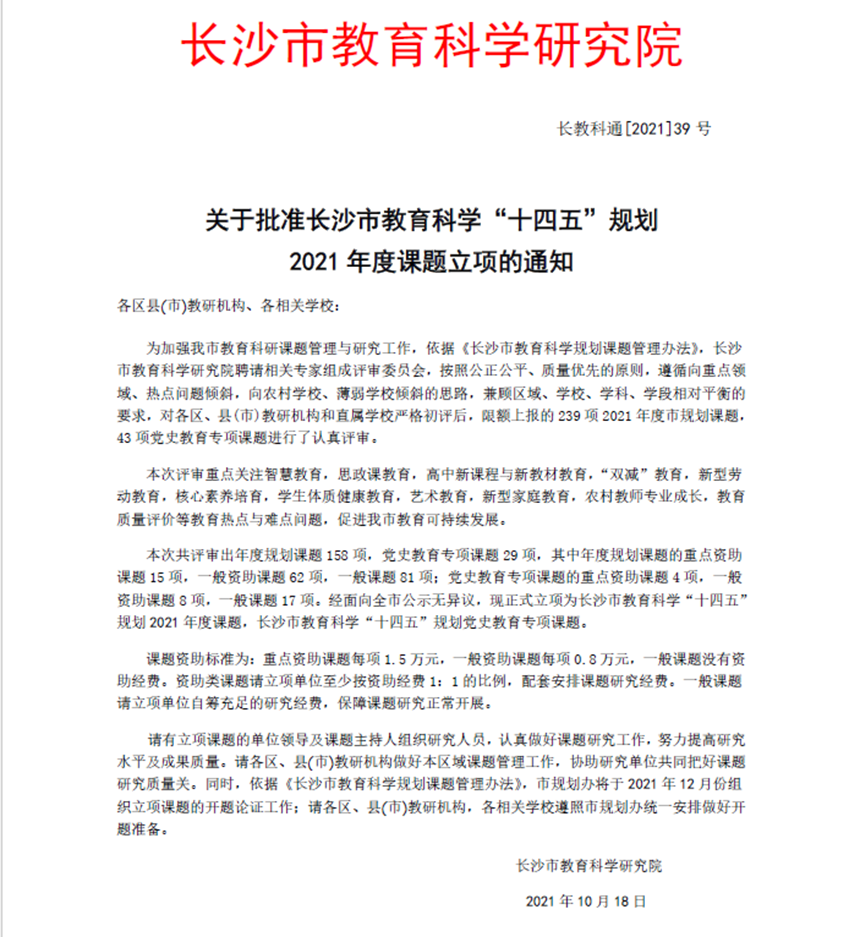 近日,长沙市教育科学研究院下达了《关于批准长沙市教育科学“十四五”规划2021年度课题立项的通知》(长教科通[2021]39号),政治组教师黄治清主持的课题《中学思政课教材学段特点及一体化教学研究》获准立项为市级一般课题。