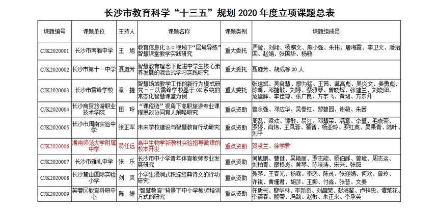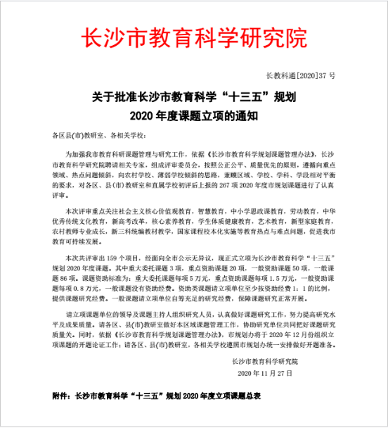 2020年底,长沙市教育科学研究院下达了《关于批准长沙市教育科学“十三五”规划2020年度课题立项的通知》(长教科通[2020]37号),生物组教师易任远主持的课题《高中生物学新教材实验指导微课的校本开发》获准立项为市级重点资助课题。