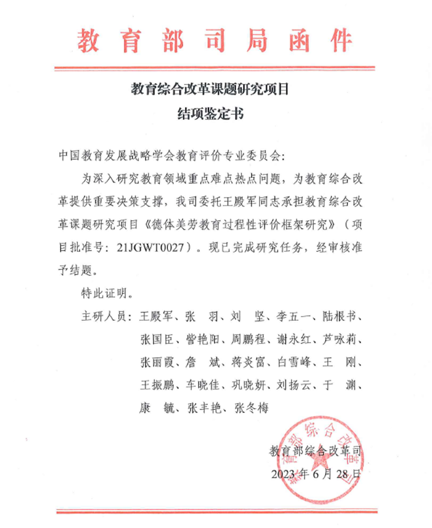 6月28日,教育部综合改革司下发《教育综合改革课题研究项目结项鉴定书》,我校参与研究的教育部重大委托课题《德体美劳教育过程性评价框架研究》(项目批准号:21JGWT0027)顺利完成研究任务,准予结题。
