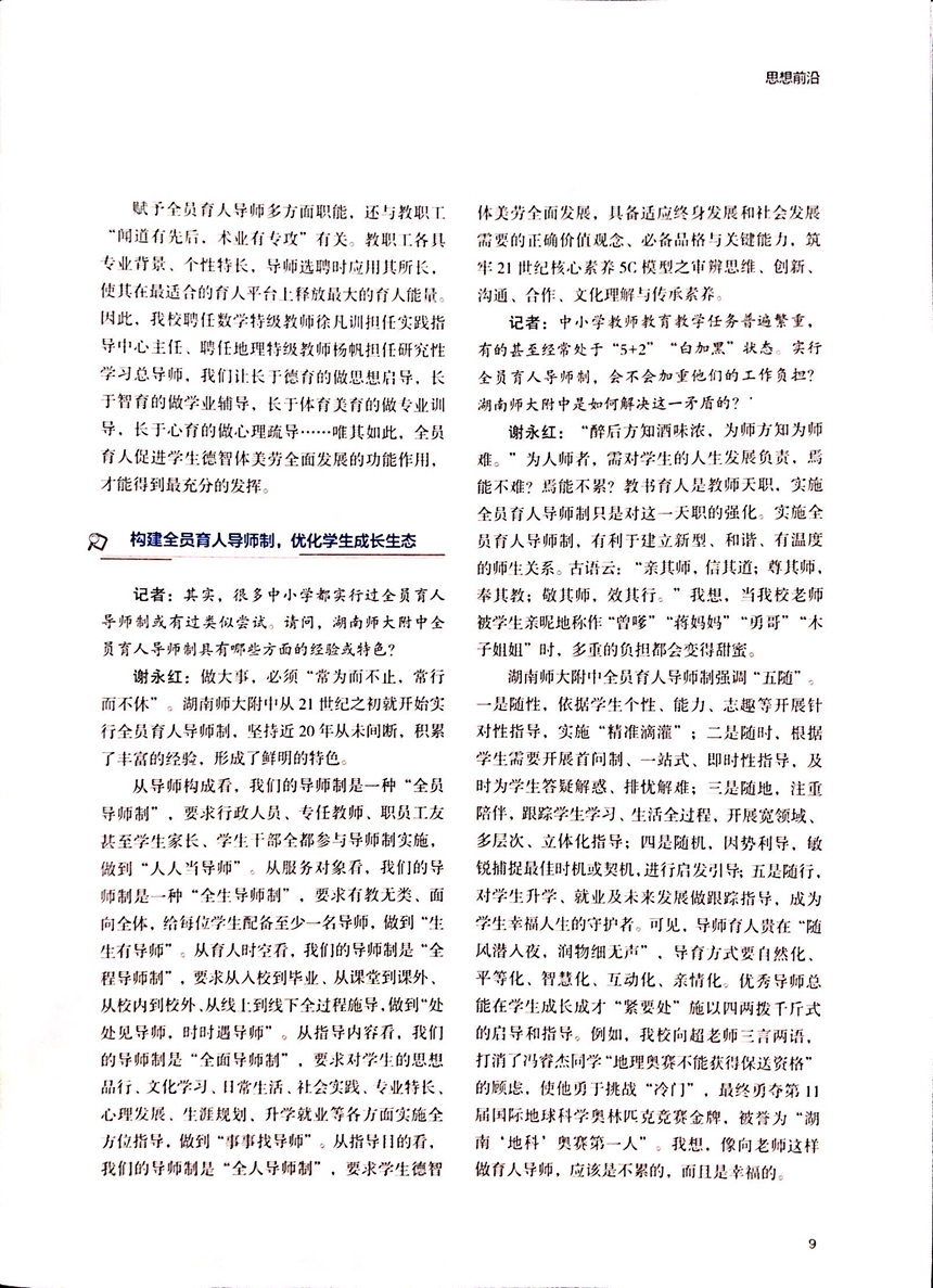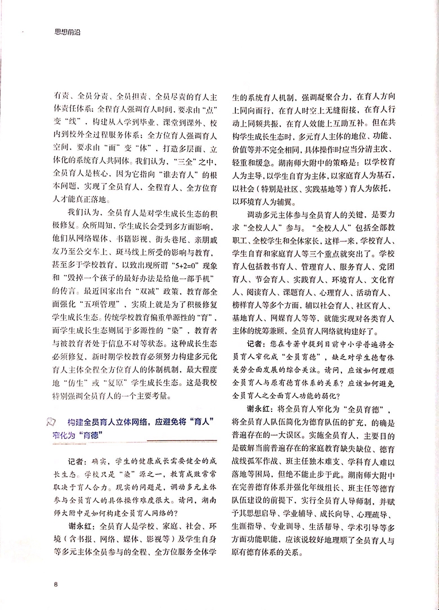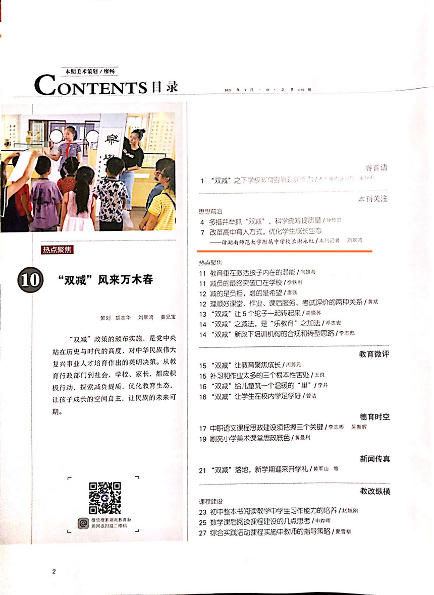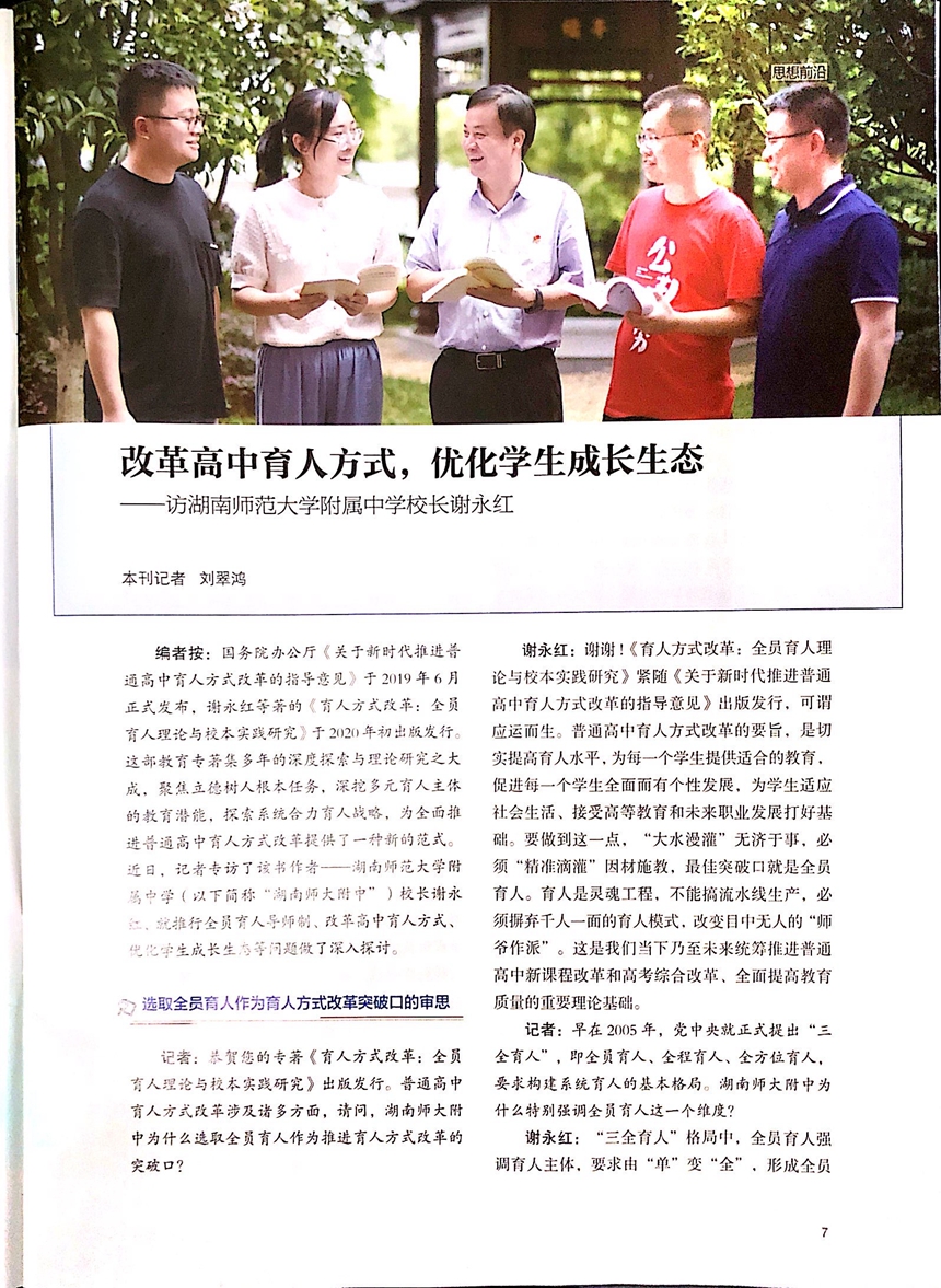 近日出版的《湖南教育》(D)总第1150期刊发《改革高中育人方式,优化学生成长生态——访湖南师范大学附属中学校长谢永红》的记者访谈(记者刘翠鸿),全面推介谢永红校长教育专著《育人方式改革:全员育人理论与校本实践研究》和他关于高中育人方式改革的思考与主张。