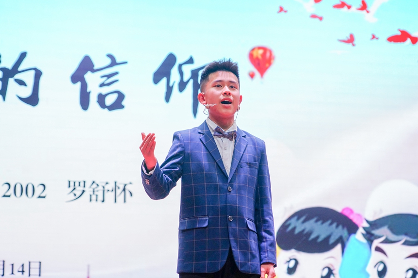 比赛开场,15位选手带来由白帆文学社原创诗朗诵《勿忘,不忘》,献给84年前在南京大屠杀中逝去的灵魂。15名选手分为高中组和初中组,紧密结合“青春向党·奋斗强国”主题,描绘着青春的各种模样:五四青年们在沉默中高歌爱国、在暗夜里造炬成阳;从南湖开天辟地的一条红船到建党百年无数仁人志士的浴血奋斗;万千青年医者志愿者的毅然逆行;三尺讲台上的桃李芬芳;午后教室里奋笔疾书的身影;雷神山火神山工地里的挥汗如雨……爱国、爱党、爱社会主义等主旋律从选手们满怀真情的讲述中不断涌现,深深感染了在场的每一个人,赢得阵阵掌声。