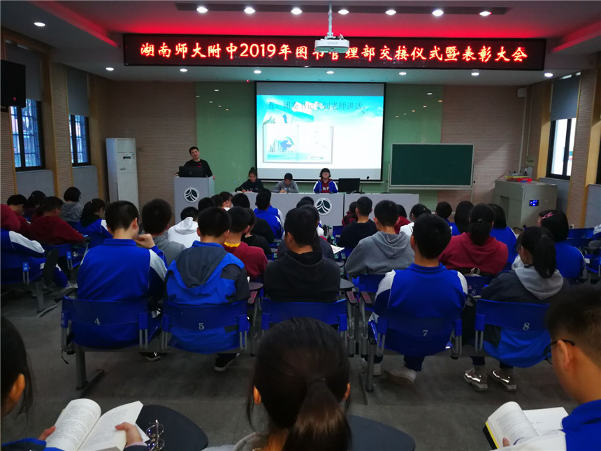 11月15日,2019年图书管理部交接仪式暨表彰大会在图书馆报告厅举行。高一、高二图书管理员代表,18级、19级图书管理部干部,共80余人参加。团委书记李钊出席会议。大会由新任部长陈思佳主持。