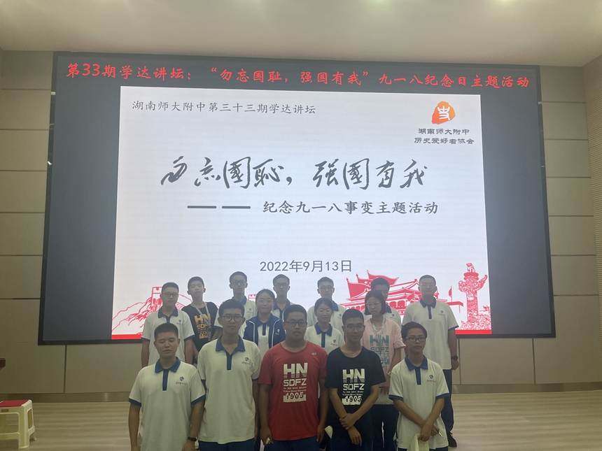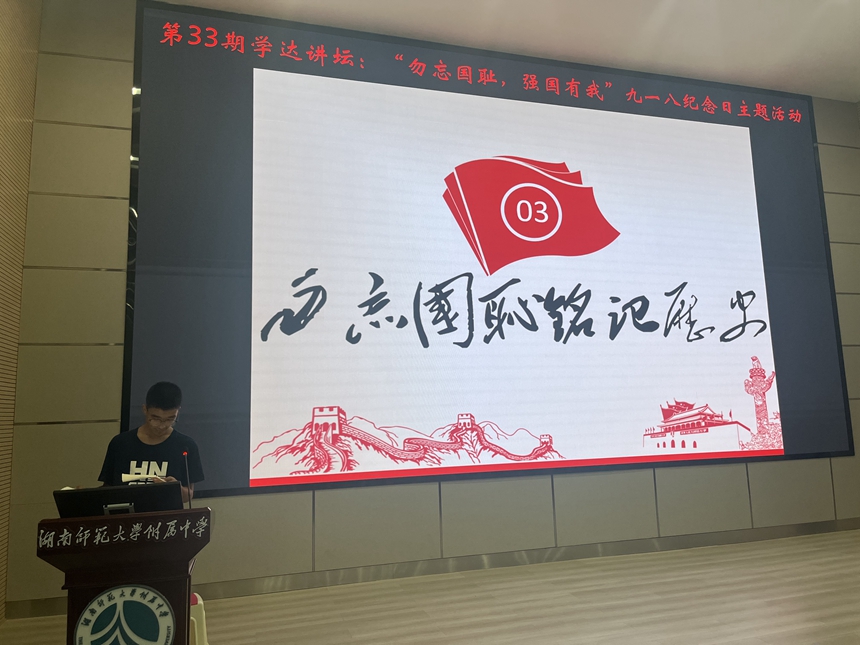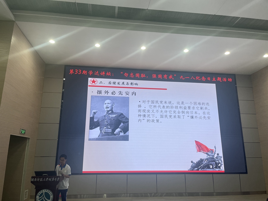 9月13日,为培育家国情怀,强化忧患意识,深化爱国主义教育,我校历史爱好者协会举办了第33期学达讲坛“勿忘国耻 强国有我”九一八纪念日主题活动。活动主讲人为历史爱好者协会社长陈九辰及成员刘雨鑫、尹泓权。