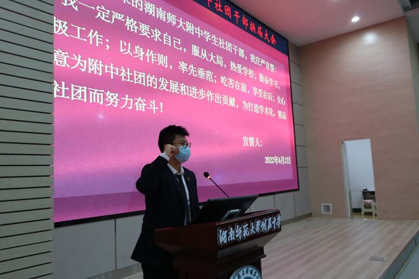 吴卿宣读新一届社团干部名单。2022-2023学年度社团干部在播音与主持协会会长梁博涵刘婷的带领下进行就职宣誓。他们表示将秉持“热情,自信,博学,共进”的精神,以建设研究型卓越中学为发展目标,牢记使命,砥砺前行,为打造新型社干团队不懈奋斗。