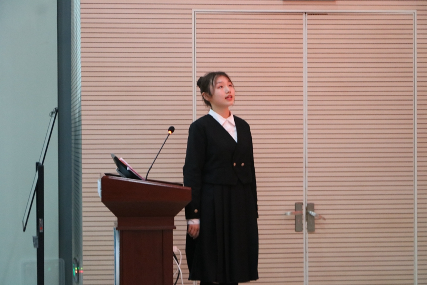 模拟联合国协会社长黎李子月代表2022-2023学年度社团干部发言,她表达了对学校、团委、上届社干的感谢,对接下来的工作提出了设想与展望,并承诺为校园文化建设贡献一份力量。