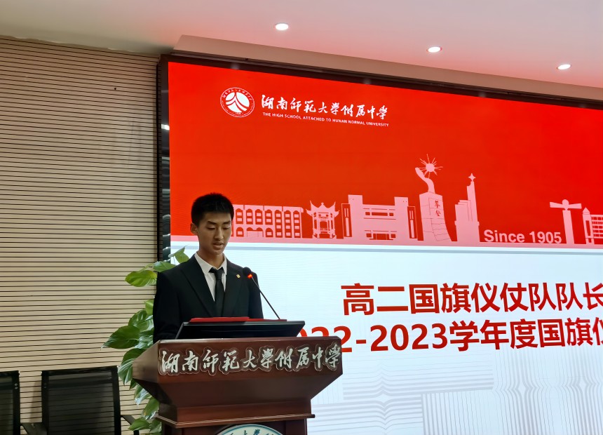 11月10日下午,湖南师范大学附属中学2023-2024学年度国旗仪仗队换届仪式在图书馆报告厅举行,德育与学生发展处主任李钊,副主任陆稳,团委副书记温宇出席活动。