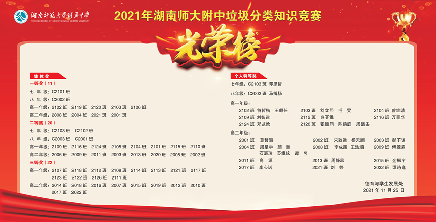 活动前,德育与学生发展处开展了学生干部垃圾分类专题培训活动,提前营造了良好氛围,广泛宣传了垃圾分类意义和知识。本次竞赛活动题目共40道选择题,时间15分钟,采用试卷和答题卡的考试方式,方便快速统计成绩。内容贴近学校生活垃圾分类投放,包括垃圾分类工作的目标、垃圾分类的意义、生活垃圾的种类区分等内容。本次竞赛活动共评出集体一等奖11个,二等奖20个,三等奖22个,个人特等奖32个。11月29日周会上,谢永红校长、黄月初书记和苏建祥副校长参加了颁奖仪式。