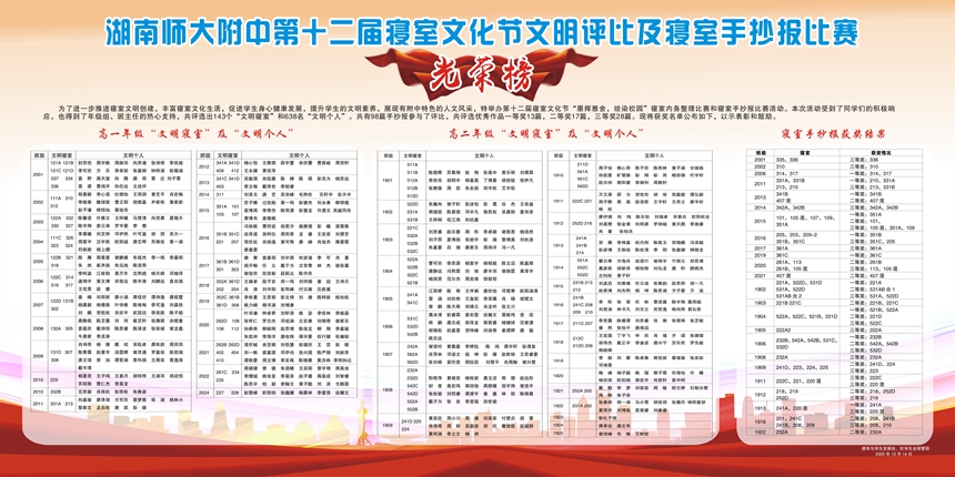 本次活动得到了同学们的积极响应和年级组、班主任的热心支持,共评选出143个“文明寝室”和638名“文明个人”。总计一百多幅作品参与了评奖,共评选优秀作品一等奖13篇,二等奖17篇,三等奖28篇。获奖名单已张榜公布,优秀手抄报作品已在宣传栏展出。这些作品通过图文结合的形式,展示了同学们的寝室生活和同学情谊,以及对现在生活的规划和对未来的畅想,内容健康向上,展现出附中特有的人文风采,也为此次活动画上了圆满的句号。