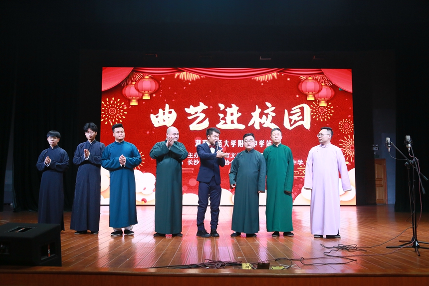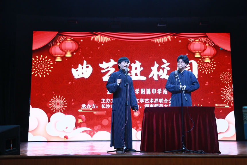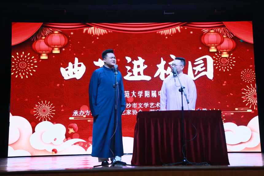 李丹、胡聪俊等曲艺明星给高一年级一千多名师生带来了一场艺术盛宴,先后上演的精彩节目有:快板《满园春》杨文辉;相声《我爱旅游》大雄、许玉龙;相声《规矩论》胡正衡、谭湘文;相声《对春联》徐来、周理;相声《学唱外国戏》李丹、胡聪俊等。
