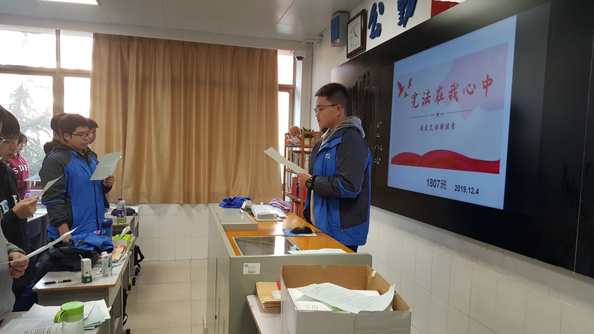我校为全面实施素质教育和弘扬社会主义核心价值观,在“12.4”国家宪法日来临之际,我校根据《教育部办公厅关于做好2015年全国教育系统宪法学习日暨全国中小学宪法晨读活动的通知》精神和师大党委宣传部的部署,组织开展了“12.4”宪法诵读活动。下午15点50新闻收视时间,宪法诵读活动开始,高一高二年级全体学生在班主任老师的带领下,按照教育部全国青少年普法网中活动组织的要求,起立并大声齐读宪法。活动的开展,让学生们进一步了解了我国的宪法以及国家宪法日的相关知识,不断增强宪法意识,传承弘扬宪法精神。