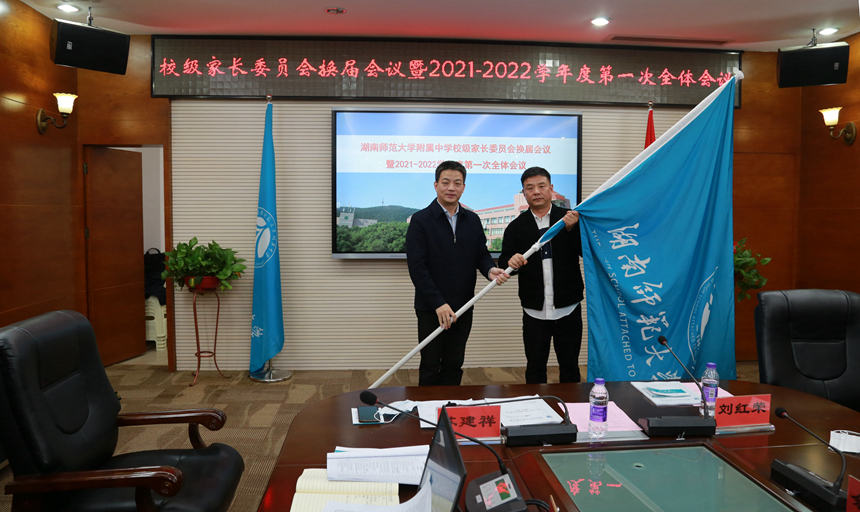 苏建祥为新一届校级家长委员会授旗,并给新委员颁发聘书和工作牌。