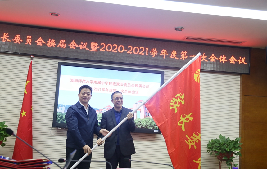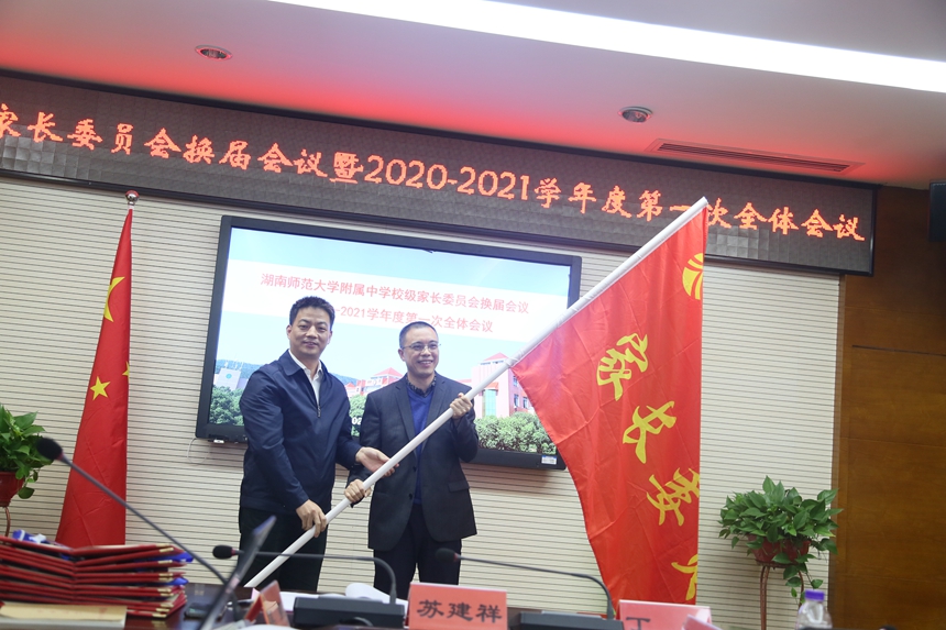 苏建祥为新一届家长委员会授旗,并向家长委员会新委员颁发聘书和工作牌。