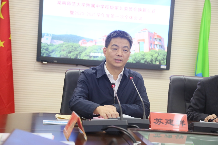 苏建祥代表学校向上一届全体家委会成员表示感谢,对新一届家委会委员就职表示热烈祝贺,他充分肯定了上一届家委会的工作成果,并指出家校间共识共为,认识一致,行动上保持了最大合力,更大程度上促进了家校和谐;老师、学生、家长都能在这样一个氛围中健康成长,学校也在过去的一年中实现了卓越发展,取得了更高成就。对新一届家委会他提出了三点要求,一是要继续发扬好附中家委会的优良传统;二是要高度重视家委会的建设工作;三是希望家长委员们多多献计献策,齐心协力,将家庭、学校、社会三者的力量通过家委会整合,促进家校和谐发展。