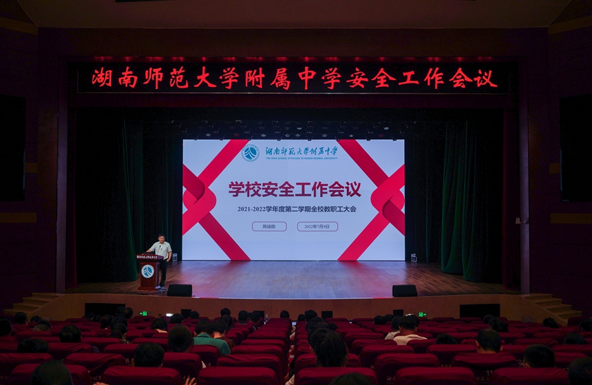 7月9日下午,学校在学生活动中心召开2021-2022学年度第二学期安全工作会议,副校长陈迪勋作安全工作报告,会议由校长谢永红主持,全体教职员工参会。