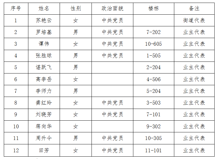 根据《物业管理条例》、《业主大会和业主委员会指导规则》等有关法规以及《关于成立湖南师大附中教职工宿舍区业主委员会的实施方案》,以楼栋为单位自荐或推荐12名符合相应条件的业主代表,在桔子洲街道的指导下成立筹备工作组,现将业主大会筹备工作组成员名单及工作职责公告如下: