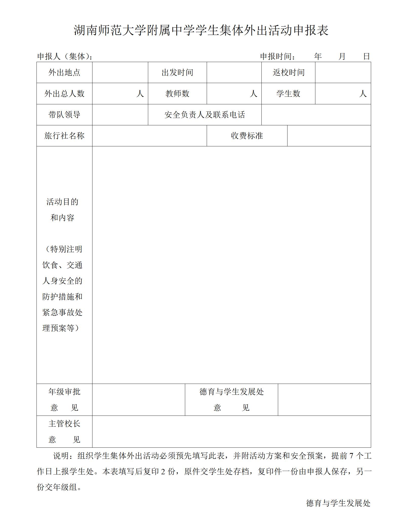 湖南师范大学附属中学学生集体外出活动申报表