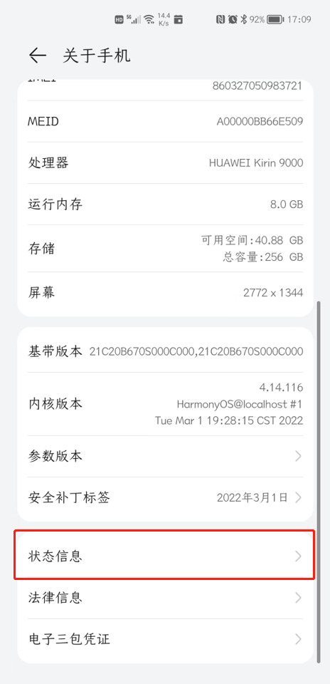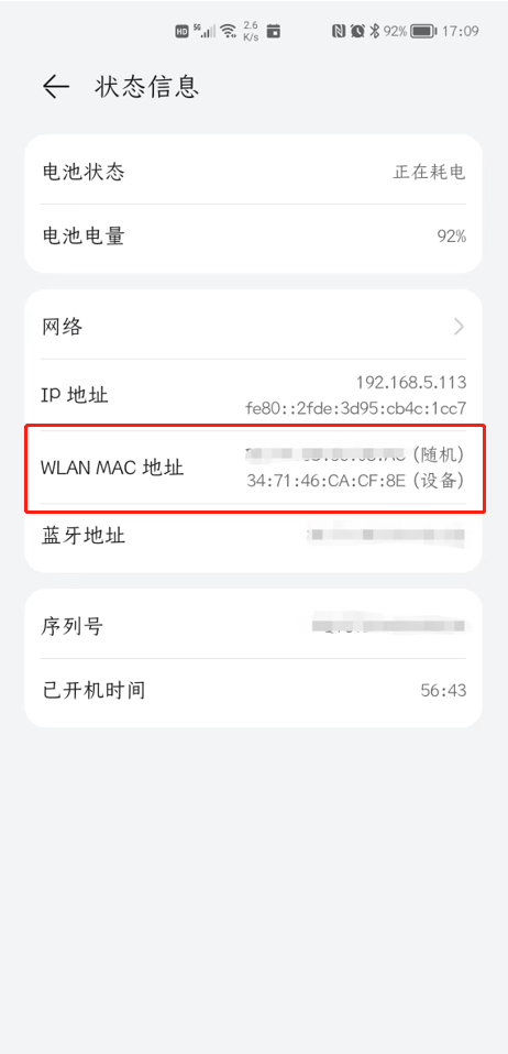 依次点击【设置】→【关于手机】→【状态信息】,即可查到改移动设备的MAC地址。(以华为手机为例)