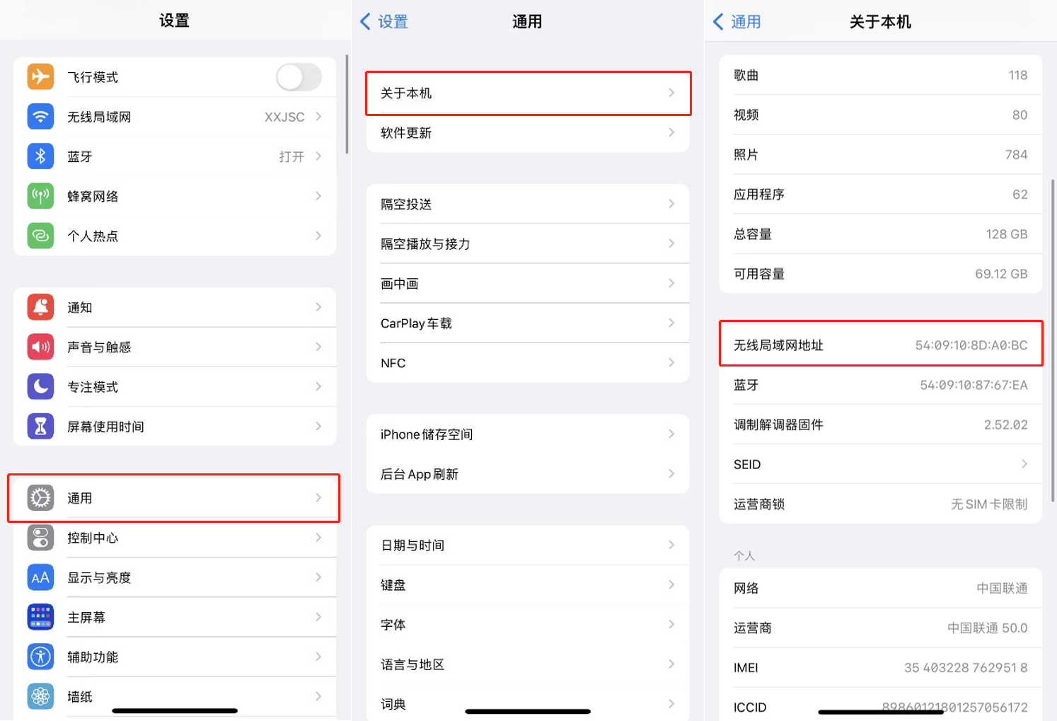 依次点击【设置】→【通用】→【关于手机】,在无线局域网地址一栏可查看设备MAC地址。