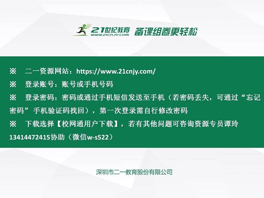 学校现已开通“21世纪教育网”校网通资源,学校教师可自行登陆使用,免费下载各科资源(课件、教案、学案、素材、试卷),包含二一书城,精优专题,名师工作室等模块资源。